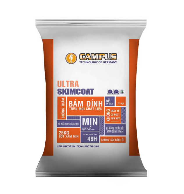 Bột bả tường Skimcoat Campus thành phần gồm hỗn hợp xi măng cường độ cao trộn cùng bột thạch anh cực mịn, polymer và phụ gia đặc biệt khác. Sản phẩm có độ bám dính cao, bề mặt nhẵn mịn, không có ngót, không nứt, dễ dàng thi công. Xử lý tốt các bề mặt vết nứt nhỏ hoặc xử lý sai sót trên tường hoặc trần nhà cho bề mặt láng mịn hơn.