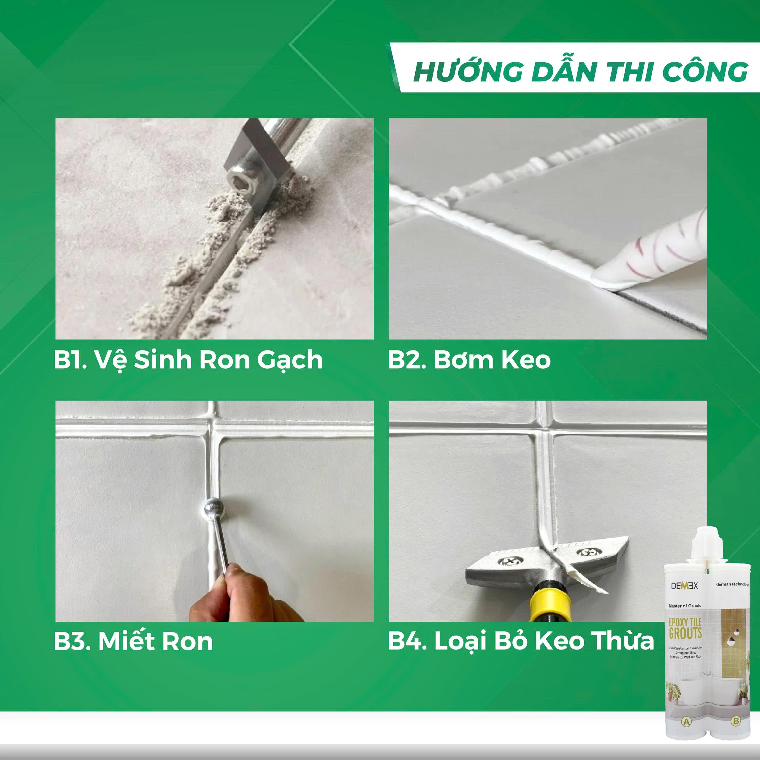 Keo chà ron bóng epoxy Tile Grouts Demex hai thành phần được sử dụng để trám các khe gạch. Sản phẩm chủ yếu sử dụng nhựa epoxy, chất đóng rắn và bột màu cao cấp làm nguyên liệu thô và áp dụng công nghệ tiên tiến. Sau khi đóng rắn cho ra thành phẩm ron có độ mịn như men gốm, độ cứng tốt, chống mài mòn, chống bám bẩn và dễ dàng vệ sinh.